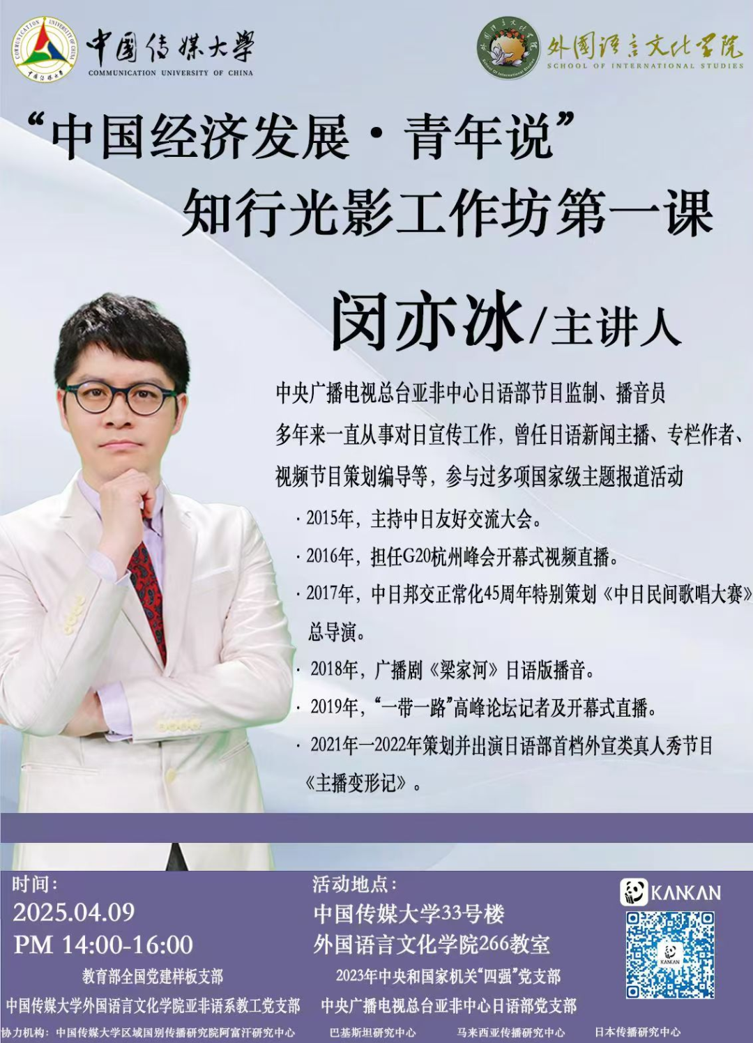 2025年4月9日,我院亚非语系教工党支部与总台亚非中心日语部党支部共建“中国经济发展・青年说”知行光影工作坊第一课即将举办。本次工作坊预计在4月~5月持续举办8课次,是继2024年两支部联学共建活动达成共识后的又一实践成果。参与本次工作坊的学生汇聚了亚非语系主要语种54人,两支部将派出青年骨干,指导并支持学生们作品创作与成果转换。