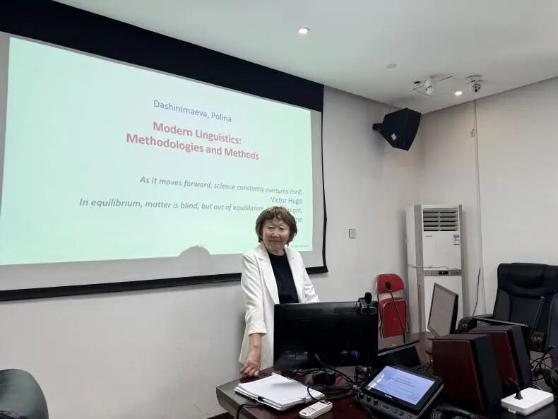 在6月4日下午举办的《现代语言学研究的方法论和研究方法》专题讲座上,Polina Dashinimaeva教授以现代语言学发展脉络为线索,探讨了不同时期语言学研究方法论的特征,展示了现代语言学研究方法论的流变过程;并以人类思维模式及其特点为抓手分析了不同时期语言学研究方法论的内在联系;还结合具体研究方法讨论了语言学研究中的常见误区。Polina Dashinimaeva教授还与在场同学进行了互动交流。