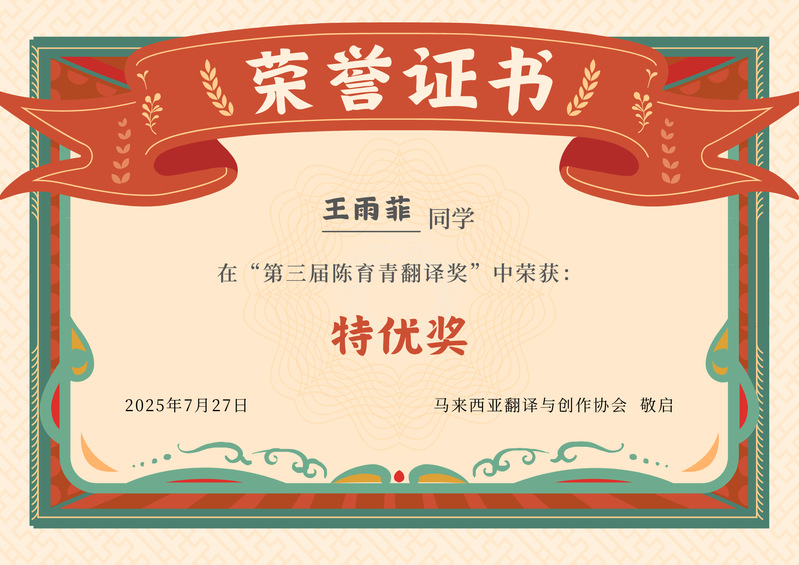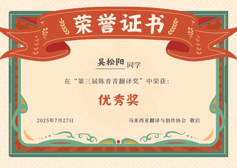 本届翻译比赛吸引了来自中国和马来西亚的翻译爱好者和高校师生,共计收到48篇参赛作品,分为马来西亚组和国际组两个组别。评委会根据翻译准确度(50%)及语言风格(50%),从两个组别分别选出6名获奖者,其中一名特优奖、两名优秀奖及三名佳作奖。我院2024级国别和区域研究(东南亚文化方向)硕士研究生王雨菲的译作《远方的巨塔》获特优奖,2021级马来语专业学生吴松阳的译作《寻常一日》获优秀奖。