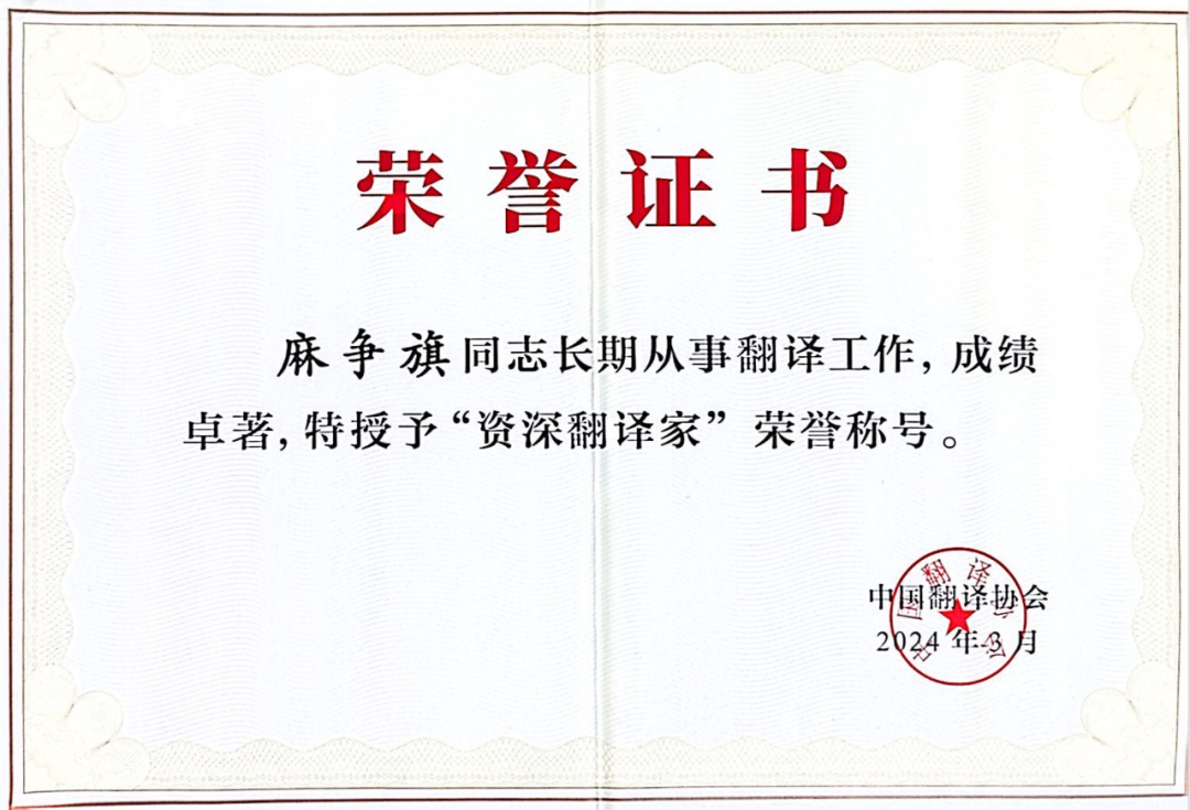 2024年3月中国译协授予麻争旗教授“资深翻译家”称号