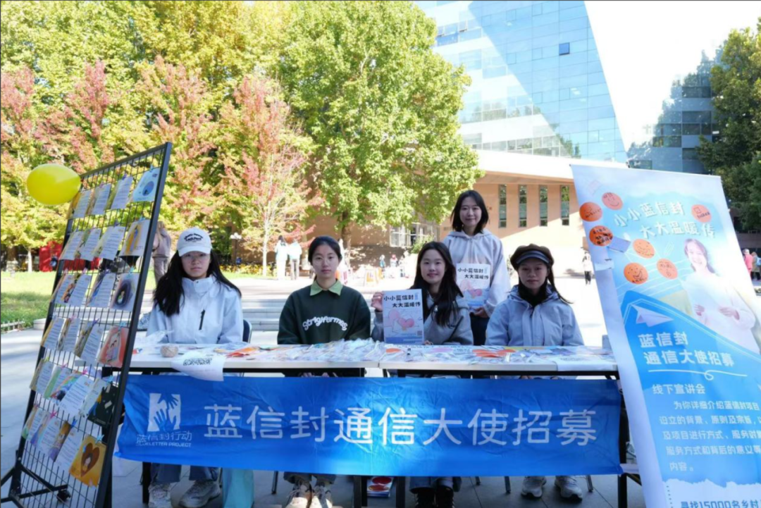 首先是蓝信封活动。本着“愿每个生命都被温暖陪伴”的初心,我们积极号召外院学子报名成为蓝信封通信大使,通过书信与乡村留守儿童建立联系,成为他们的倾听者与陪伴者,在鼓励、倾听与陪伴彼此中,实现双向成长。从2023年10月起,我们已经成功举办了三场大型线下摆台招募和宣讲会活动,吸引了600余名志愿者报名成为蓝信封通信大使,和乡村留守儿童展开“一月一封信,持续一年半”的通信活动。