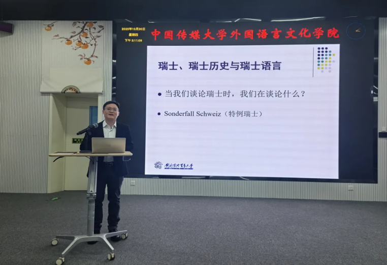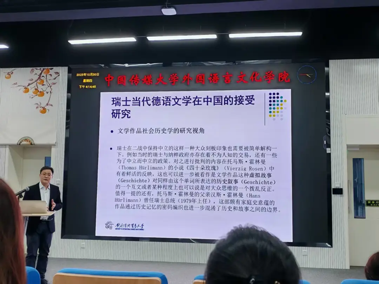 恰逢中国传媒大学秋季读书周之际,2025年10月30日下午,由中国传媒大学区域国别传播研究院德国传播研究中心、中东欧传播研究中心联合主办的“瑞士当代德语文学在中国的翻译、传播与接受研究”专题讲座在外国语言文化学院成功举行。