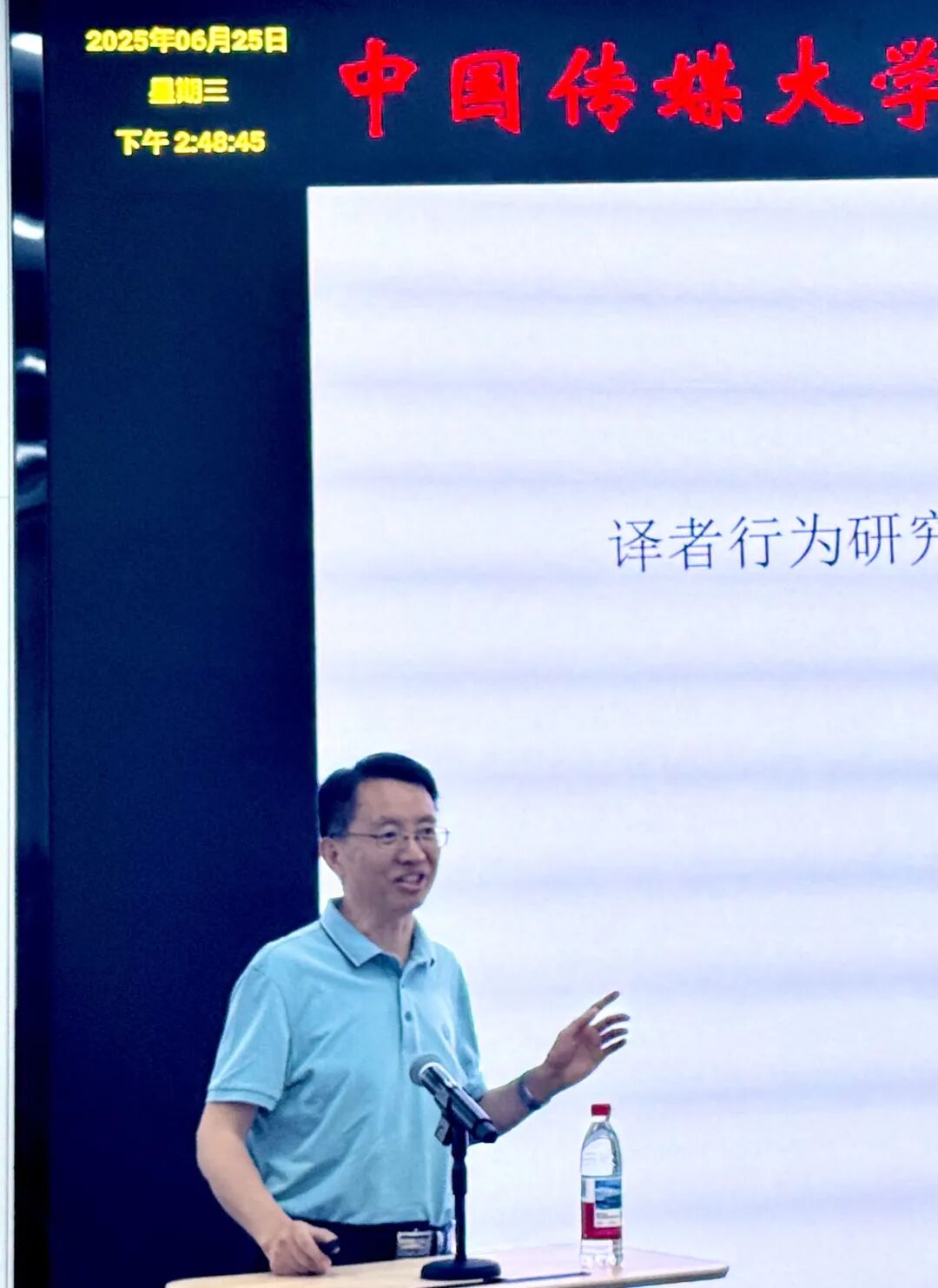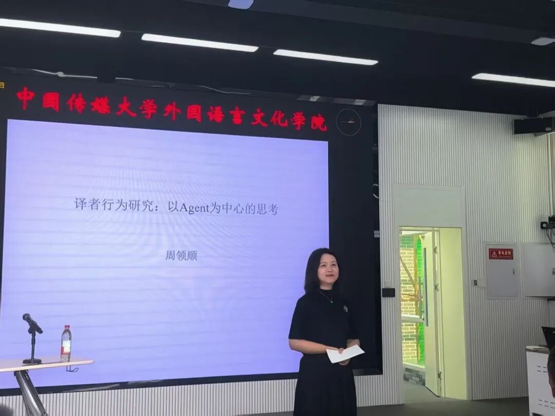 2025年6月25日,中国英汉语比较研究会副会长、全国知名翻译学者、译者行为批评理论创建者周领顺教授应邀来我院,作题为“译者行为研究:以Agent为中心的思考”的学术讲座。本次讲座由中国传媒大学外国语言文化学院副院长刘颖教授主持,学院部分教师及研究生到场聆听。讲座开始前,刘颖教授对周领顺教授的到来表示欢迎,并简要介绍了其在译者行为研究领域的探索成果与学术贡献。