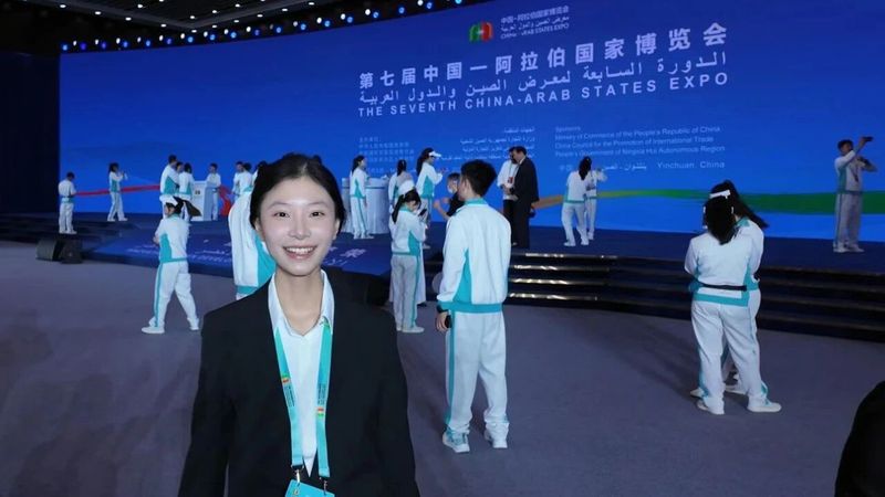 工作中,她负责多方对接协调、物料审核打包,还在彩排现场提供交替传译,保障筹备顺畅。她深刻体会“细节决定成败”,从舞台尺寸到物料标点,细节均需反复确认。她也借《道德经》“天下难事,必做于易;天下大事,必做于细”,道出对大型活动执行的全新认知,同时期待本届中阿博览会华彩启幕。